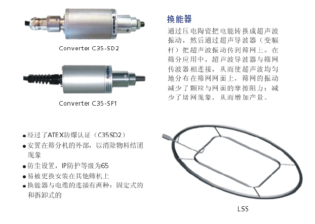 超聲波篩分系統(tǒng)是一種簡單實用、可靠的篩分系統(tǒng),是當(dāng)前解決振動篩在篩選過程中網(wǎng)孔堵塞的方法。并且可增加過篩效率2-3倍之間。廣泛應(yīng)用于食品、制藥、冶金、化工、選礦等要求精細篩分過濾的行業(yè),篩分過濾精度高,有效的解決因團聚、靜電、強吸附性卡網(wǎng)、堵網(wǎng)等難題,是國內(nèi)篩分行業(yè)的一項重大技術(shù)突破。
