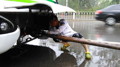 12時(shí)30分,207路車(chē)在行至開(kāi)平路段時(shí)出現(xiàn)故障。機(jī)務(wù)隊(duì)長(zhǎng)張繼民立即開(kāi)著拖車(chē)前往現(xiàn)場(chǎng),不料返回途中拖車(chē)也壞了,得知情況的隊(duì)長(zhǎng)立即與修理車(chē)間聯(lián)系,又派出安全員孫濤、張利明和修理工王金偉火速趕赴現(xiàn)場(chǎng)冒雨搶修,直至晚上六點(diǎn)多,故障車(chē)和拖車(chē)才順利返回車(chē)場(chǎng),而參與搶修的幾名工作人員早已經(jīng)全身濕透。