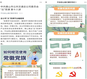 另外,總公司黨委還組織領(lǐng)導(dǎo)班子成員對(duì)《中國(guó)共產(chǎn)黨黨徽黨旗條例》內(nèi)容進(jìn)行了學(xué)習(xí),并將如何規(guī)范使用黨旗黨徽的規(guī)定內(nèi)容制作成“云黨課”,下發(fā)各基層黨組織及黨員干部進(jìn)行學(xué)習(xí)。