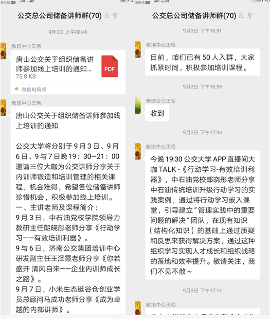結(jié)合當前疫情防控形勢及總公司儲備講師培養(yǎng)需求,總公司教培中心積極轉(zhuǎn)變工作思路,多次與公交大學及公交同行對接,經(jīng)過前期精心籌備,分別于9月3日、9月6日、9月7日晚19:30-21:00組織總公司儲備講師參加了公交大學關(guān)于“講師技術(shù)和講師成長”相關(guān)的三場免費在線直播培訓課程。